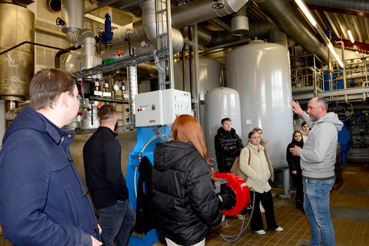 Zum Abschluss des zweitägigen Workshops fand ein Klima- Stadtrundgang mit Stadtwerke Geschäftsführer Manfred Erne (Bild rechts) entlang des Nahwärmenetzes in Verbindung mit dem Projekt „Altstadt für Alle“ sowie dem Besuch der Heizzentrale statt. Dabei wurde auch auf das wichtige Zusammenspiel der einzelnen Gewerke und aller Akteure eingegangen und die Herausforderungen besprochen. Besonders beeindruckt zeigten sich die Auszubildenden vom hocheffizienten Blockheizkraftwerk und der weiteren Technik in der Heizzentrale.